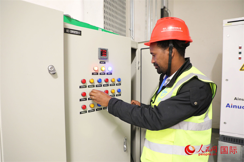 埃塞本地員工托馬斯在維修機(jī)庫內(nèi)檢測設(shè)備。人民網(wǎng)記者 沈小曉攝