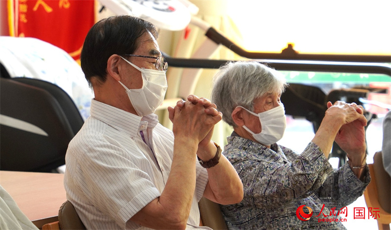 在日本的一家養(yǎng)老機構(gòu),清野明(左)和若生豐美(右)正在一起做手指操。人民網(wǎng) 許可攝