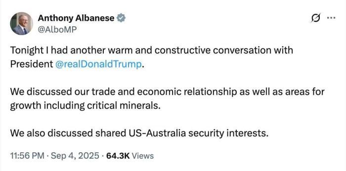 阿爾巴尼斯在社交媒體上發(fā)文稱,他與特朗普又一次進行了“熱情而富有建設性”的對話。雙方討論了經(jīng)貿(mào)關系、關鍵礦產(chǎn)等合作領域以及美澳共同安全利益等問題。