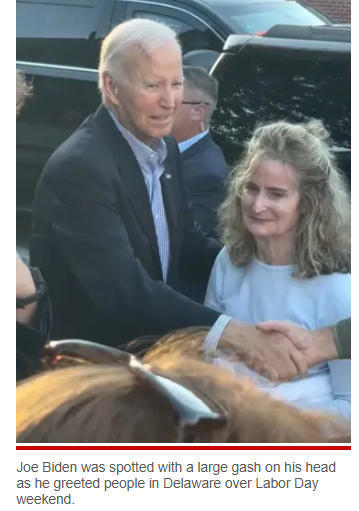 報(bào)道稱,社交媒體上流傳的一段畫面顯示,現(xiàn)年82歲的拜登顯得虛弱,額頭有一道明顯的紅色傷口,部分被白發(fā)遮蓋。