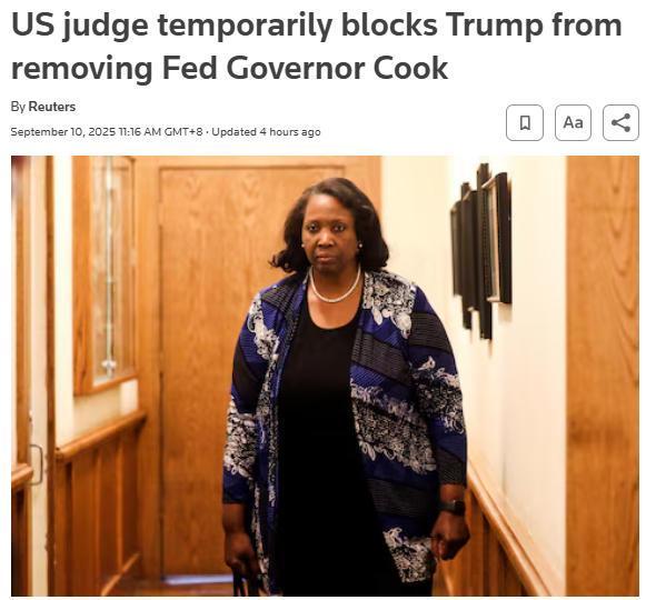 中新網(wǎng)9月10日電 據(jù)路透社報(bào)道,當(dāng)?shù)貢r(shí)間9日,一名美國(guó)聯(lián)邦法官暫時(shí)阻止了美國(guó)總統(tǒng)特朗普罷免美聯(lián)儲(chǔ)理事麗莎·庫(kù)克的企圖。