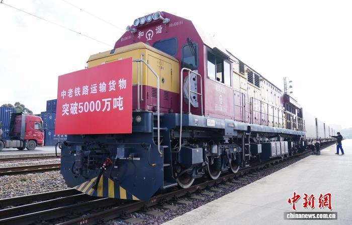 2025年1月2日,一列滿載新鮮果蔬的中老鐵路國際貨物列車從中國云南昆明啟程駛向老撾,標志著自2021年12月3日全線開通運營以來,中老鐵路貨物運輸總量突破5000萬噸。 中新社記者 劉冉陽 攝