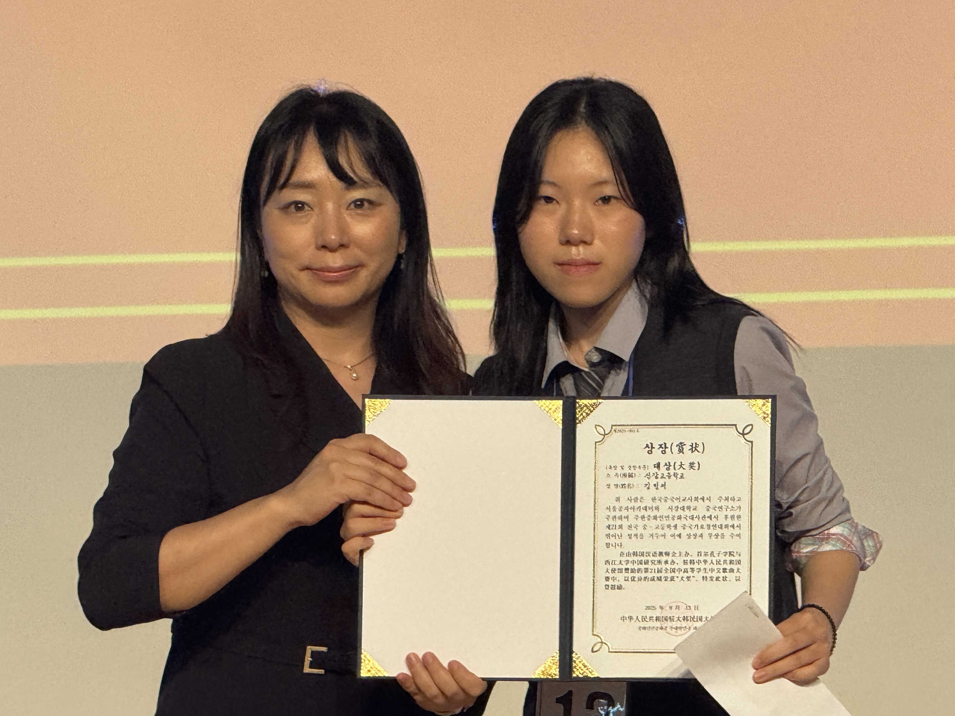 | 13日,“第21屆全國中學生中文歌曲大賽”在韓國舉行。圖為獲獎選手與頒獎嘉賓合影。韓國中國語教師會供圖 |