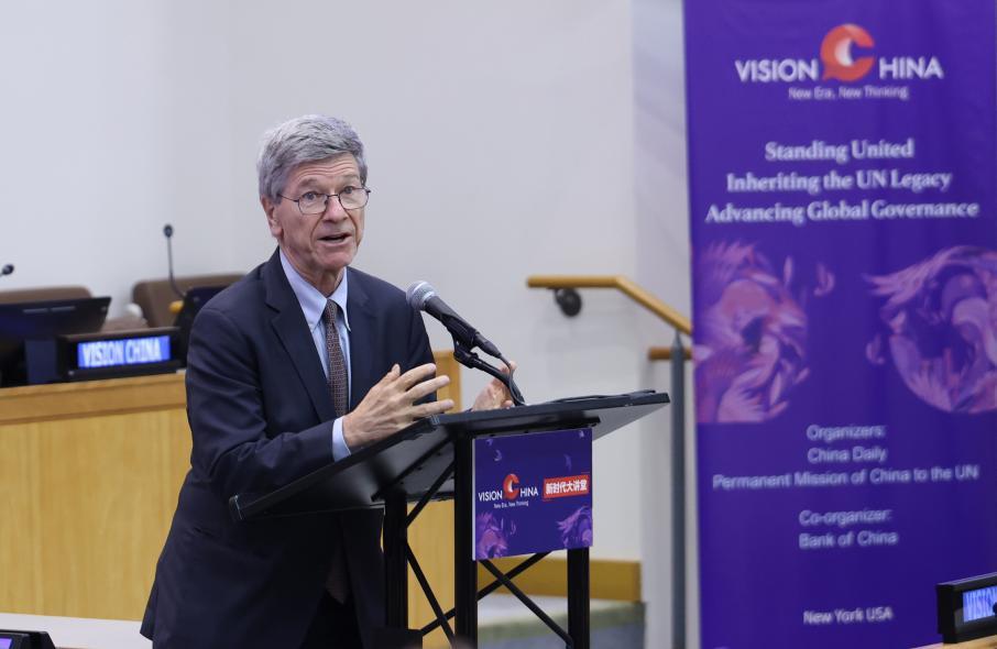 哥倫比亞大學(xué)可持續(xù)發(fā)展中心主任、教授杰弗里·薩克斯發(fā)表演講。中國日報(bào)記者 馮永斌 攝