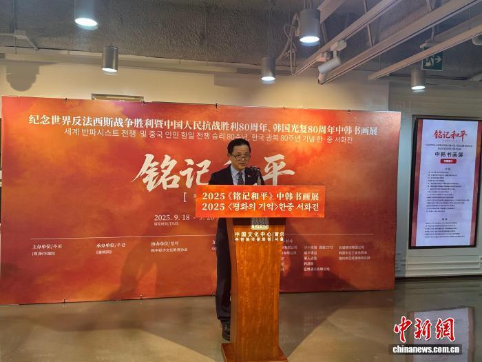 9月18日,《銘記和平——紀(jì)念世界反法西斯戰(zhàn)爭暨中國人民抗戰(zhàn)勝利80周年、韓國光復(fù)80周年中韓書畫展》在首爾中國文化中心開幕。圖為中國駐韓國大使戴兵致辭。姜春雨 攝