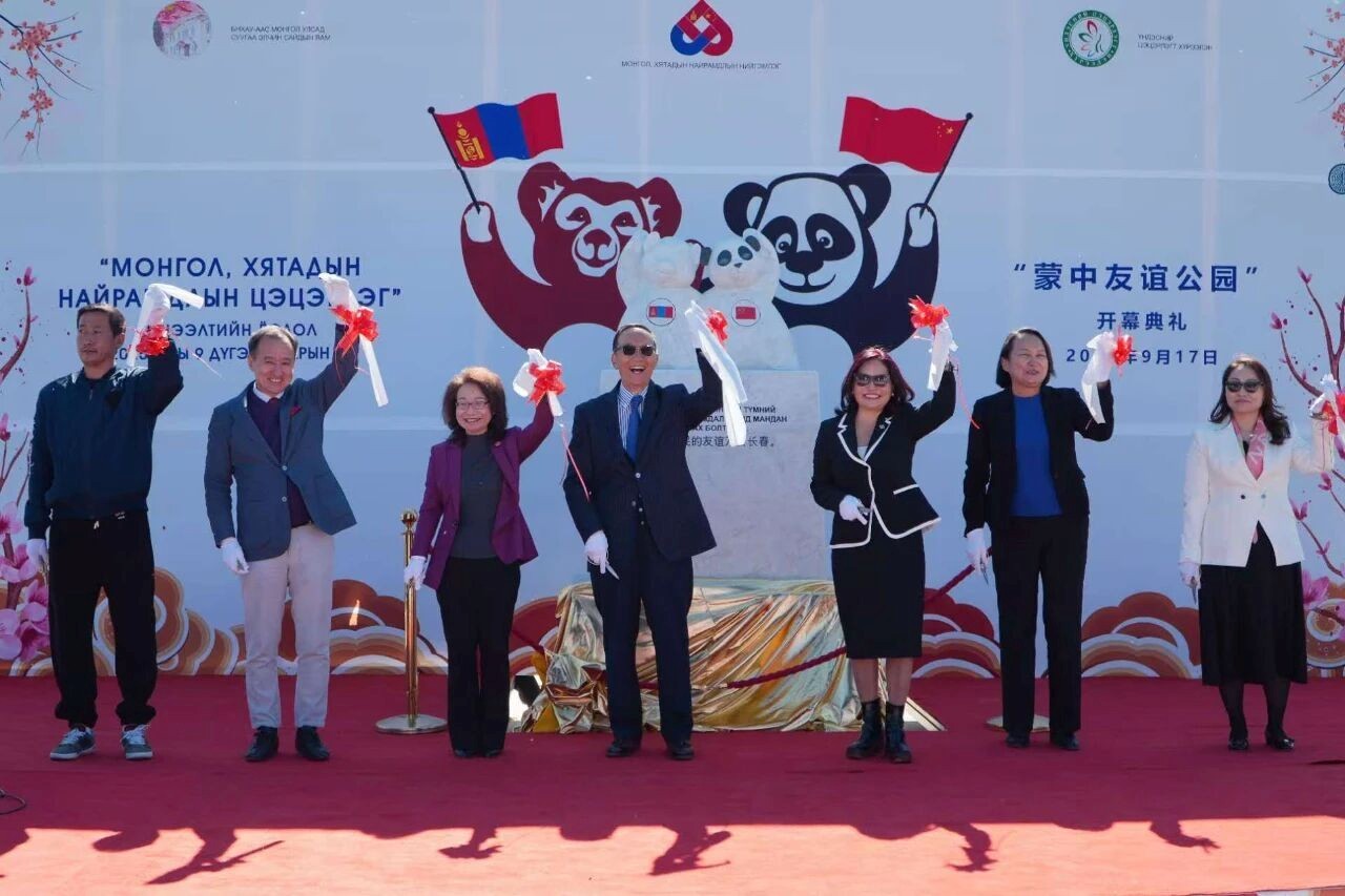 活動(dòng)上,中蒙嘉賓共同為中蒙友誼園剪彩,并為“大熊貓與戈壁熊”雕塑揭幕。大家卓有興致地觀看了中蒙關(guān)系歷史事件介紹,欣賞了內(nèi)蒙古藝術(shù)團(tuán)和蒙古國(guó)希望漢語學(xué)校帶來的精彩表演。