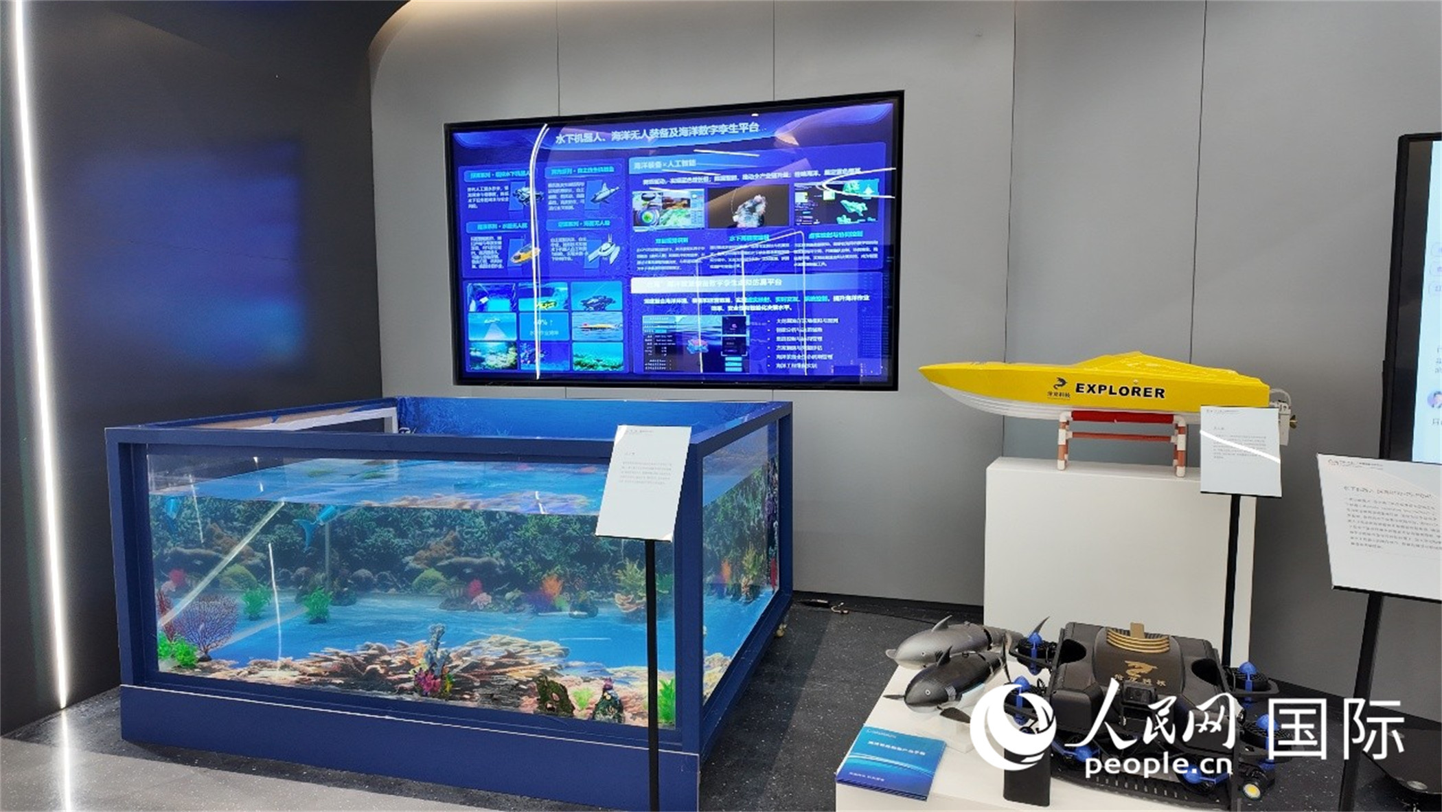 水下機(jī)器人、海洋無人裝備及海洋數(shù)字孿生平臺(tái)。人民網(wǎng) 張醴泉攝