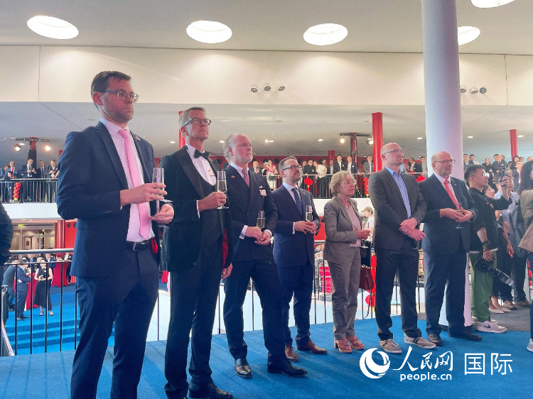 人民網(wǎng)杜伊斯堡9月19日電 (記者劉赫)當(dāng)?shù)貢r間19日,中國駐杜塞爾多夫總領(lǐng)館在杜伊斯堡瑪麗安門劇院舉行國慶招待會,慶祝中華人民共和國成立76周年,并歡迎總領(lǐng)事余勇履新。北威州第一副議長施梅爾策、杜伊斯堡市長林克、北威州經(jīng)濟部外貿(mào)司司長特勞佩爾、諾伊斯行政區(qū)長官、杜塞爾多夫第一副市長等州市代表以及來自北威州政界、經(jīng)濟界、教育界和文化界的友好人士,僑團代表、華僑華人、中資企業(yè)和留學(xué)生代表等300余人出席。