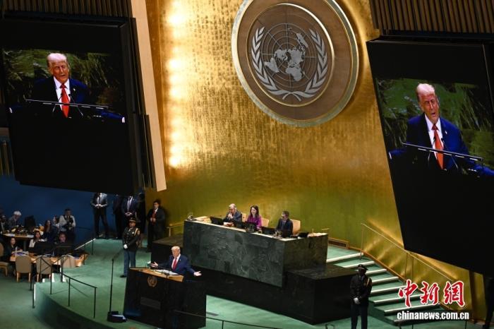 當(dāng)?shù)貢r(shí)間9月23日,紐約聯(lián)合國(guó)總部,第80屆聯(lián)合國(guó)大會(huì)一般性辯論開(kāi)幕。圖為美國(guó)總統(tǒng)特朗普發(fā)言。中新社記者 陳孟統(tǒng) 攝