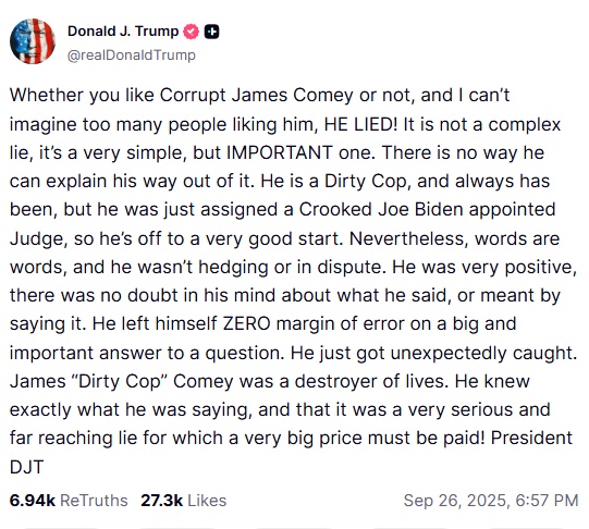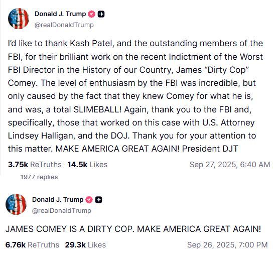 十幾個小時后,也許依然意難平,特朗普又發(fā)一篇長帖文,把科米形容為“骯臟警察”,“他曾經(jīng)是、如今還是個徹頭徹尾的卑鄙小人”。特朗普同時對現(xiàn)任聯(lián)邦調(diào)查局局長帕特爾的工作表示肯定,并對負(fù)責(zé)處理本案的相關(guān)人員表達(dá)感謝。