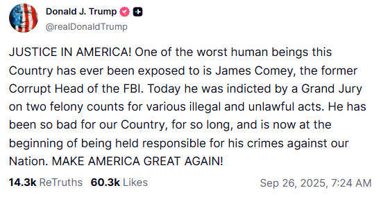 科米被起訴消息公布后,特朗普立即在社交媒體上表示“慶祝”,稱科米“長期以來對美國非常壞”,現(xiàn)在“正義終于得到伸張”。就在數(shù)天前,特朗普還在社交媒體上發(fā)帖,抱怨司法部對科米的調(diào)查遲遲沒有下文,要求盡快對科米提起訴訟。