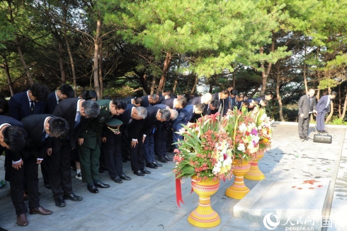 圖為王亞軍大使帶領中方一行向志愿軍烈士墓鞠躬默哀。 人民網(wǎng)記者 劉融攝