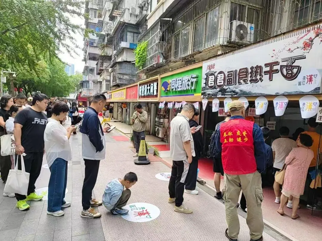 國慶中秋假期,江漢區(qū)游客量激增,君君副食的隊伍從店門口蜿蜒著排出數(shù)十米。社區(qū)志愿者舉著醒目的提示牌引導停車,網(wǎng)格員把路邊的共享單車統(tǒng)一移走,引導著慕名而來的食客井然有序地排隊等候?!耙郧耙坏焦?jié)假日就發(fā)愁,客人擠得轉(zhuǎn)不開身,現(xiàn)在有專人維持秩序,生意反而更穩(wěn)當了?!钡曛饔喟⒁滩林~頭的汗笑言。