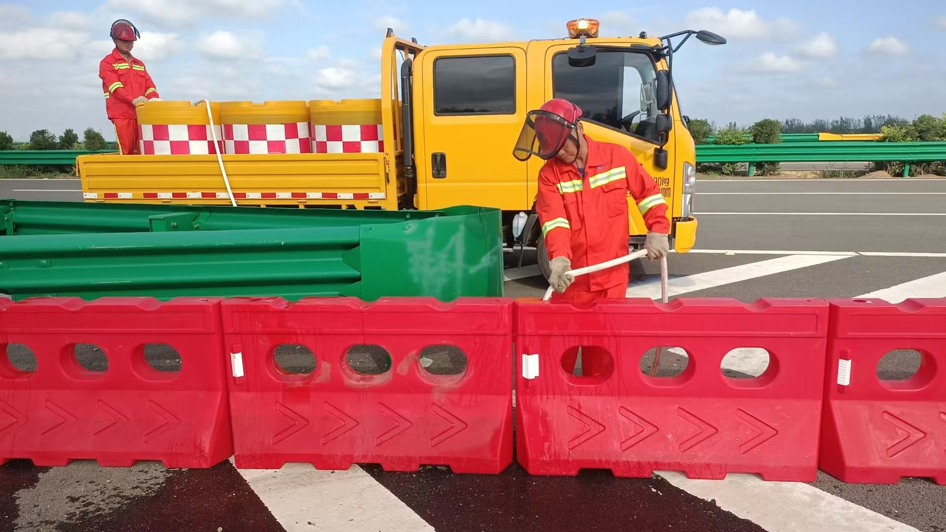 圖:漢孝向K291+487三角端擺放警示提醒的水馬并進(jìn)行應(yīng)急注水