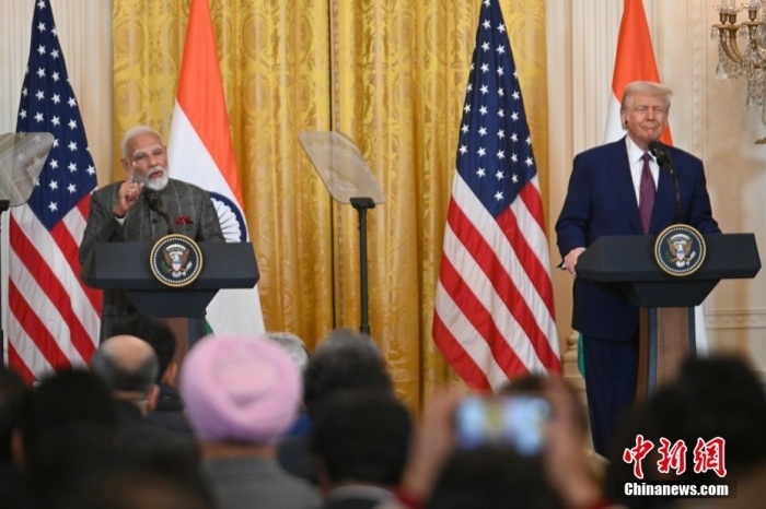 當?shù)貢r間2月13日,華盛頓,美國總統(tǒng)特朗普與來訪的印度總理莫迪在白宮舉行會晤。圖為雙方在會晤后出席聯(lián)合記者會。中新社記者 陳孟統(tǒng) 攝