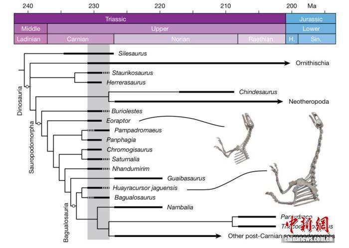該論文介紹,晚三疊世(約2.37億-2.01億年前)的生態(tài)系統(tǒng)發(fā)生了急劇變化,導致恐龍、哺乳動物的早期近親以及包括鱷魚在內的動物種群崛起和分化??铸堅缙谘莼脑S多證據都發(fā)現于南美,大部分關鍵發(fā)現局限于阿根廷和巴西的兩個盆地地區(qū)。