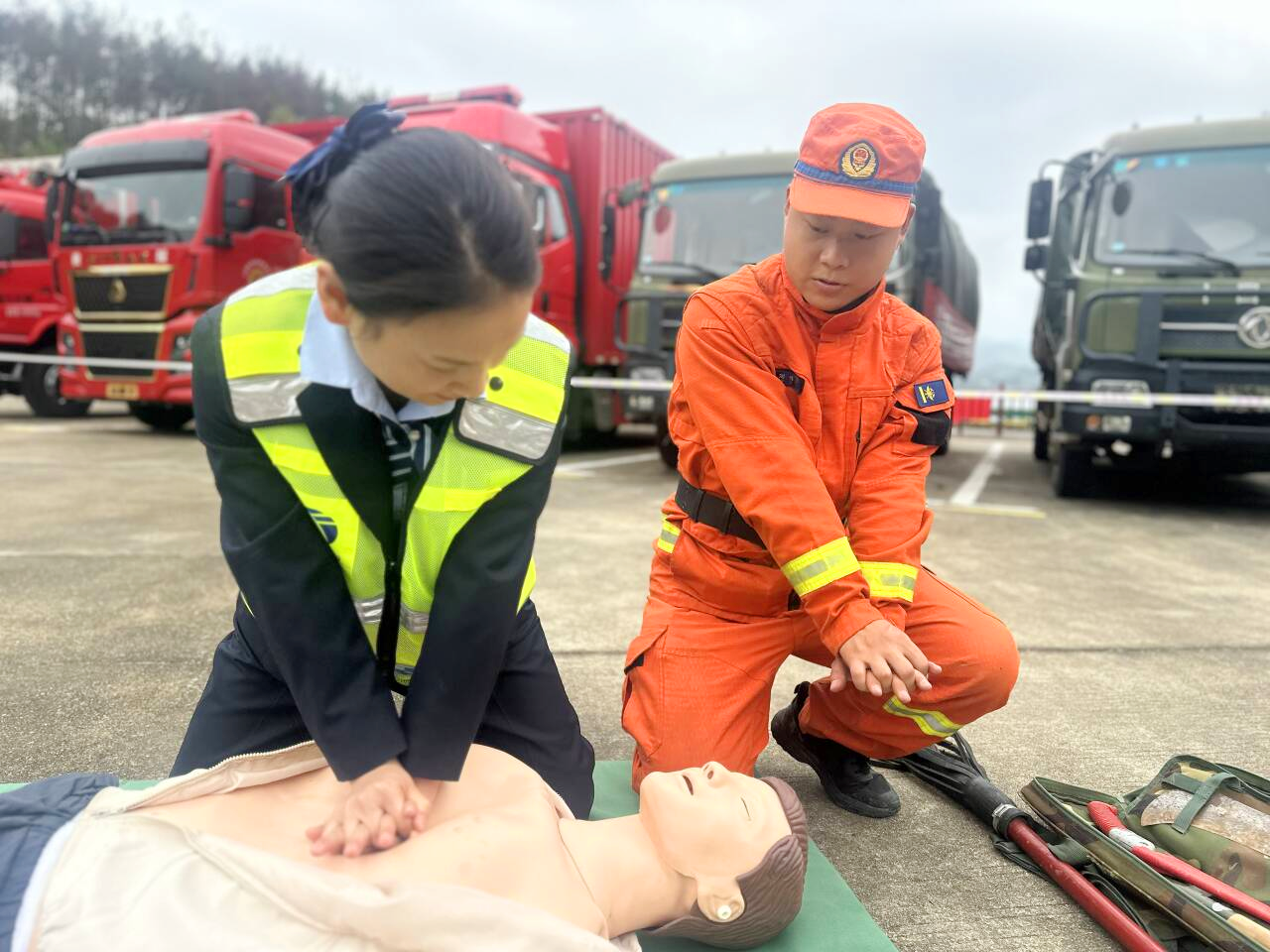 急救實訓后,消防作戰(zhàn)車變“移動教具”,成為現(xiàn)場培訓的又一亮點。消防人員打開裝備艙,展示高壓水炮、破拆工具等設備,結合救援案例講解功能用途,還介紹極端環(huán)境下裝備的替代使用技巧,員工圍車觀察、提問,近距離感受專業(yè)裝備“實戰(zhàn)力”。