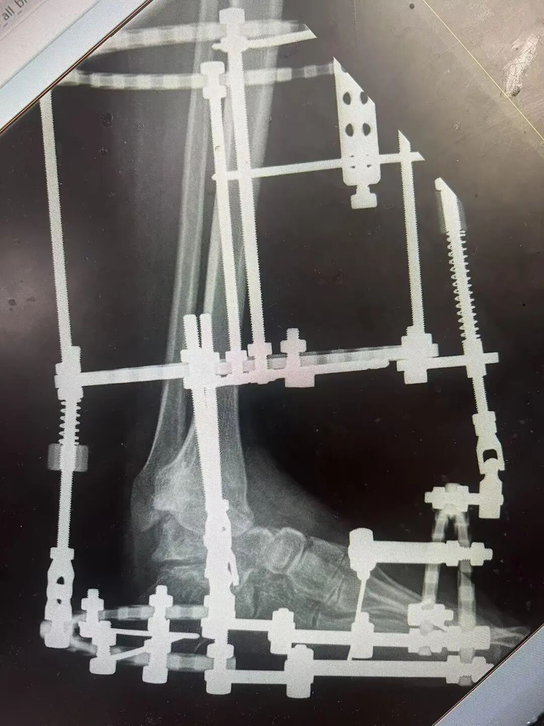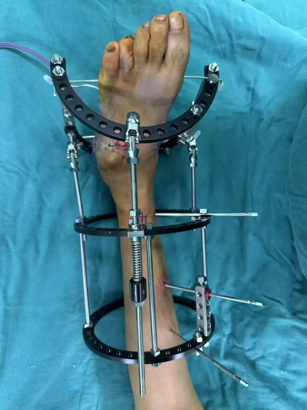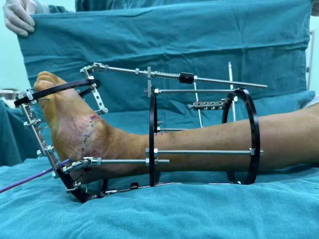 針對陽先生的復(fù)雜情況,鄭群龍醫(yī)師團隊制定了詳盡的手術(shù)方案:左踝關(guān)節(jié)融合+馬蹄足畸形矯正+跟腱延長+外固定架固定術(shù)。手術(shù)的核心,正是伊里扎洛夫技術(shù)。這項技術(shù)如同精密的“時空建筑學(xué)”,通過微創(chuàng)安裝環(huán)形外固定架,前足-后足安裝鋼環(huán),再將足的鋼環(huán)與脛骨的固定鋼環(huán)在踝關(guān)節(jié)前、后、左、右用帶關(guān)節(jié)的螺紋桿連接,由此構(gòu)建成一個能體外牽拉調(diào)控的三維立體構(gòu)型,在術(shù)后進(jìn)行精準(zhǔn)、緩慢的調(diào)整,一寸一寸逐步將畸形的骨骼、軟組織恢復(fù)到正常位置。