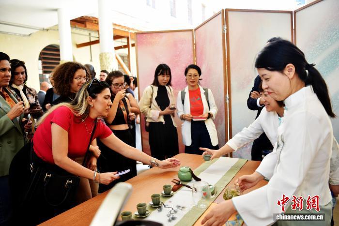 10月24日,巴西圣保羅,巴西觀眾在巴西移民博物館里品味中國絲綢博物館工作人員沏的杭州龍井茶。記者林春茵攝