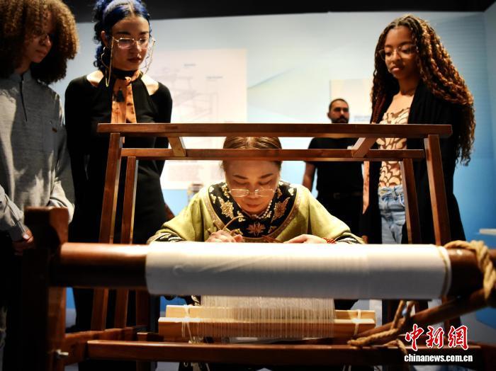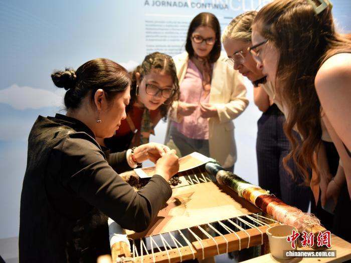 10月24日,巴西圣保羅,巴西觀眾在巴西移民博物館里觀看中國傳統(tǒng)織錦技藝。記者林春茵攝