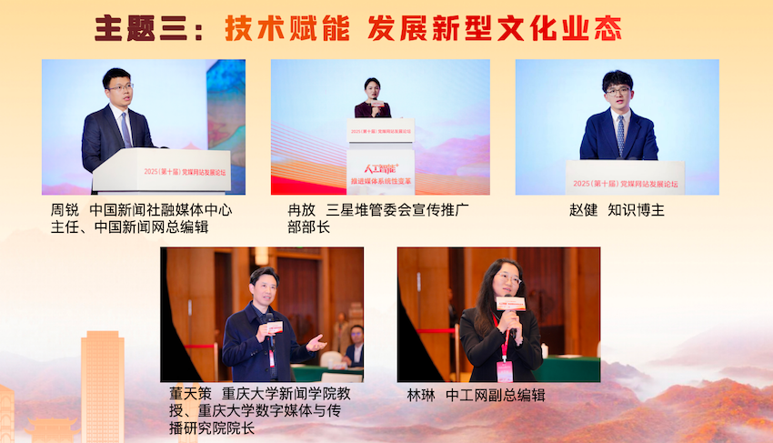 在“技術(shù)賦能 發(fā)展新型文化業(yè)態(tài)”主題研討環(huán)節(jié),中國新聞社融媒體中心主任、中國新聞網(wǎng)總編輯周銳,三星堆管委會宣傳推廣部部長冉放,知識博主趙健,分別就技術(shù)賦能中華文化“破圈”出海、三星堆文化傳播數(shù)智實踐、短視頻文化傳播等方面的經(jīng)驗成果進(jìn)行了精彩展示。重慶大學(xué)新聞學(xué)院教授、重慶大學(xué)數(shù)字媒體與傳播研究院院長董天策,中工網(wǎng)副總編輯林琳作為互動嘉賓進(jìn)行了點評,期待主流媒體發(fā)揮傳播實踐智慧,在內(nèi)容、技術(shù)和社會責(zé)任之間找到平衡,鑄造中華文化新輝煌。