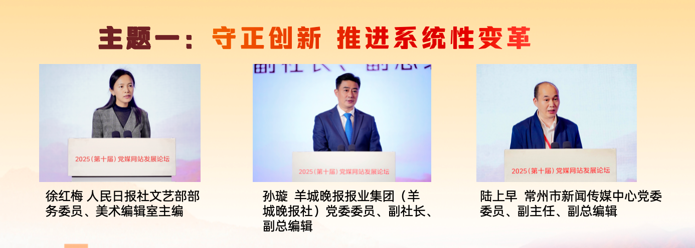 在“守正創(chuàng)新 推進(jìn)系統(tǒng)性變革”主題研討環(huán)節(jié),人民日報社文藝部部務(wù)委員、美術(shù)編輯室主編徐紅梅,羊城晚報報業(yè)集團(tuán)(羊城晚報社)黨委委員、副社長、副總編輯孫璇,常州市新聞傳媒中心黨委委員、副主任、副總編輯陸上早分別作主旨發(fā)言,介紹了各自領(lǐng)域推進(jìn)系統(tǒng)性變革、發(fā)展新時代中國特色社會主義文化的實踐與探索。徐紅梅表示,“每日讀畫”采取“AI+美術(shù)”“微視頻+夜讀”的形式,堅持“讀準(zhǔn)、讀細(xì)、讀新、讀美”,讓AI成為深入畫境、開啟古今對話的共創(chuàng)者,以動態(tài)轉(zhuǎn)譯、意境擴展、流程再造、視聽融合開發(fā)美術(shù)融媒的敘事潛能,深入挖掘中華文明賡續(xù)傳承的基因密碼,成為探索主流媒體系統(tǒng)性變革的微觀樣本。孫璇表示,羊城晚報全面啟動系統(tǒng)性變革,以做強媒體、文化、數(shù)據(jù)、產(chǎn)業(yè)四個戰(zhàn)略板塊為重點,把“技術(shù)賦能”嵌入系統(tǒng)性變革各關(guān)鍵板塊,積極增強文化傳播、促進(jìn)文化交流和繁榮文化生產(chǎn)。陸上早表示,常州借“蘇超”東風(fēng),走出城市轉(zhuǎn)型與能級躍升之路。改革的推進(jìn)需聚焦六大方向:組織體系化,內(nèi)容精品化,傳播移動化,技術(shù)現(xiàn)代化,分配績效化,干部年輕化。