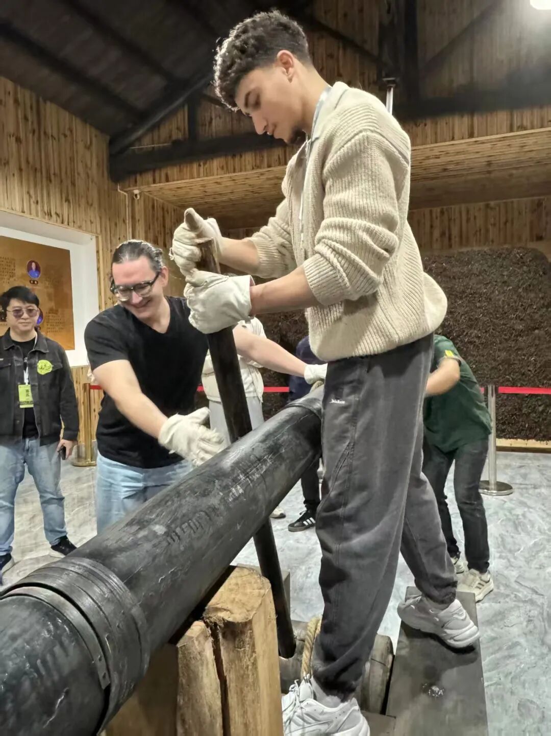 留學(xué)生在中國青磚茶非遺技藝傳承館體驗壓制青磚茶。