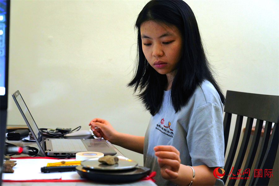 中方隊(duì)員彭勝藍(lán)對(duì)2025年調(diào)查石制品進(jìn)行測(cè)量統(tǒng)計(jì)。人民網(wǎng)記者 黃煒鑫攝
