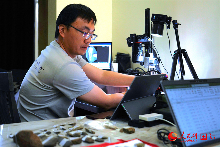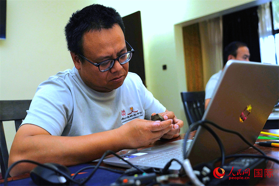 中方隊(duì)員顧雪軍對(duì)第10地點(diǎn)出土石制品進(jìn)行分類整理。人民網(wǎng)記者 黃煒鑫攝