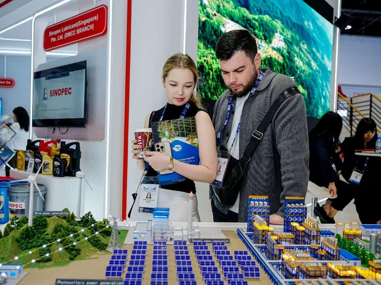 第41屆阿布扎比國際石油展期間,與會人士在參觀中國石化展出的綠電制氫項目沙盤。主辦方供圖