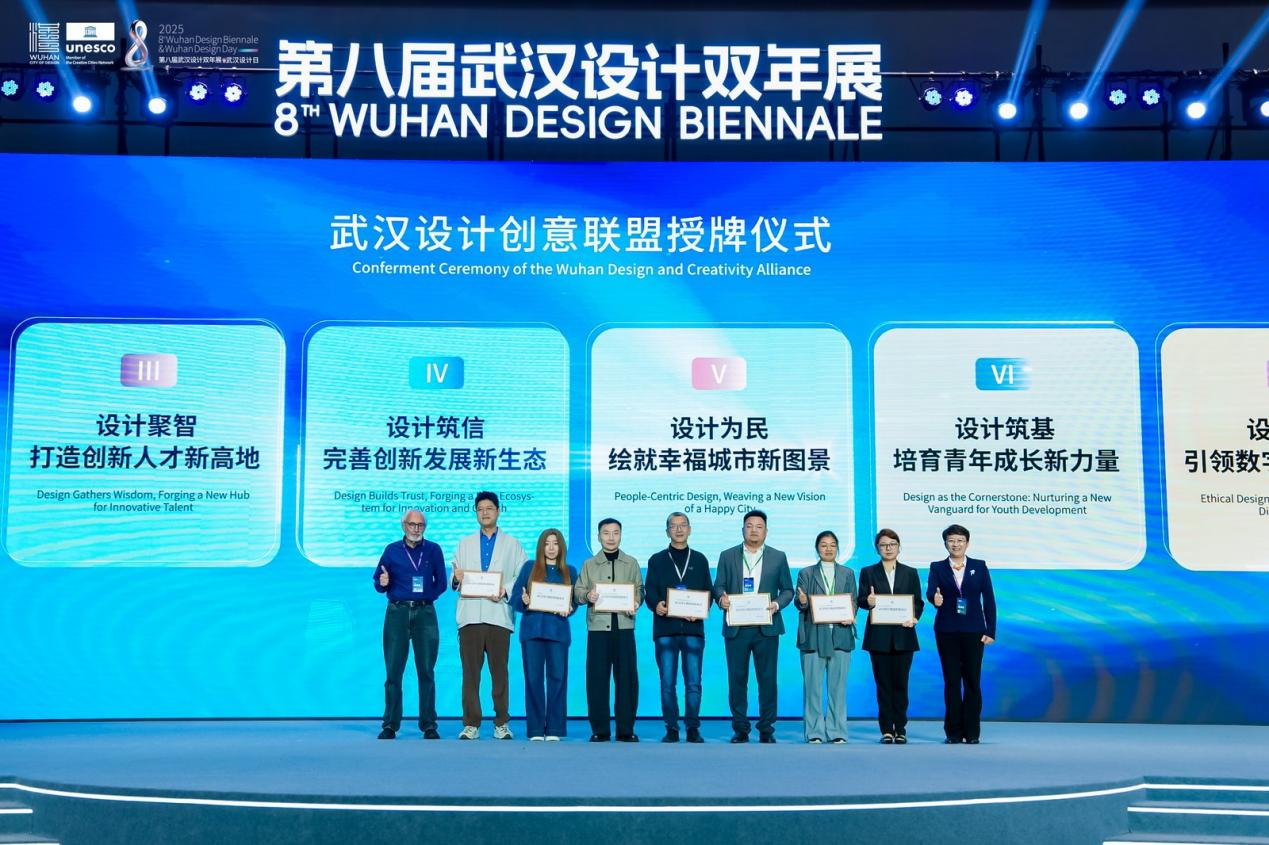 武漢有設(shè)計(jì)相關(guān)專業(yè)高校50余所,設(shè)計(jì)專業(yè)在校學(xué)生近10萬(wàn)人,設(shè)計(jì)相關(guān)企業(yè)突破1萬(wàn)家,10余個(gè)設(shè)計(jì)行業(yè)協(xié)會(huì),從業(yè)人員超50萬(wàn),形成了強(qiáng)大的“設(shè)計(jì)創(chuàng)意聯(lián)盟”,催生出了集產(chǎn)業(yè)鏈、創(chuàng)新鏈、人才鏈、價(jià)值鏈于一體的融合創(chuàng)新發(fā)展生態(tài)體系。在開(kāi)幕式的最后,“武漢設(shè)計(jì)創(chuàng)意聯(lián)盟”正式授牌,來(lái)自設(shè)計(jì)企業(yè)、行業(yè)協(xié)會(huì)、高校院所和獨(dú)立設(shè)計(jì)師等領(lǐng)域多元設(shè)計(jì)力量代表共同見(jiàn)證。未來(lái),“武漢設(shè)計(jì)創(chuàng)意聯(lián)盟”將奮力實(shí)現(xiàn)設(shè)計(jì)融城,構(gòu)筑協(xié)同發(fā)展新范式;設(shè)計(jì)賦能,激活產(chǎn)業(yè)升級(jí)新動(dòng)能;設(shè)計(jì)聚智,打造創(chuàng)新人才新高地;設(shè)計(jì)筑信,完善創(chuàng)新發(fā)展新生態(tài);設(shè)計(jì)為民,繪就幸福城市新圖景;設(shè)計(jì)筑基,培育青年成長(zhǎng)新力量;設(shè)計(jì)向善,引領(lǐng)數(shù)字文明新航向;設(shè)計(jì)聯(lián)通,拓展國(guó)際交往新空間八大目標(biāo)。