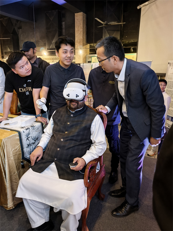 11月7日晚,巴基斯坦國(guó)家遺產(chǎn)與文化部部長(zhǎng)奧朗則布在中國(guó)旅游文化周活動(dòng)展區(qū)體驗(yàn)VR設(shè)備。中國(guó)駐巴基斯坦使館供圖