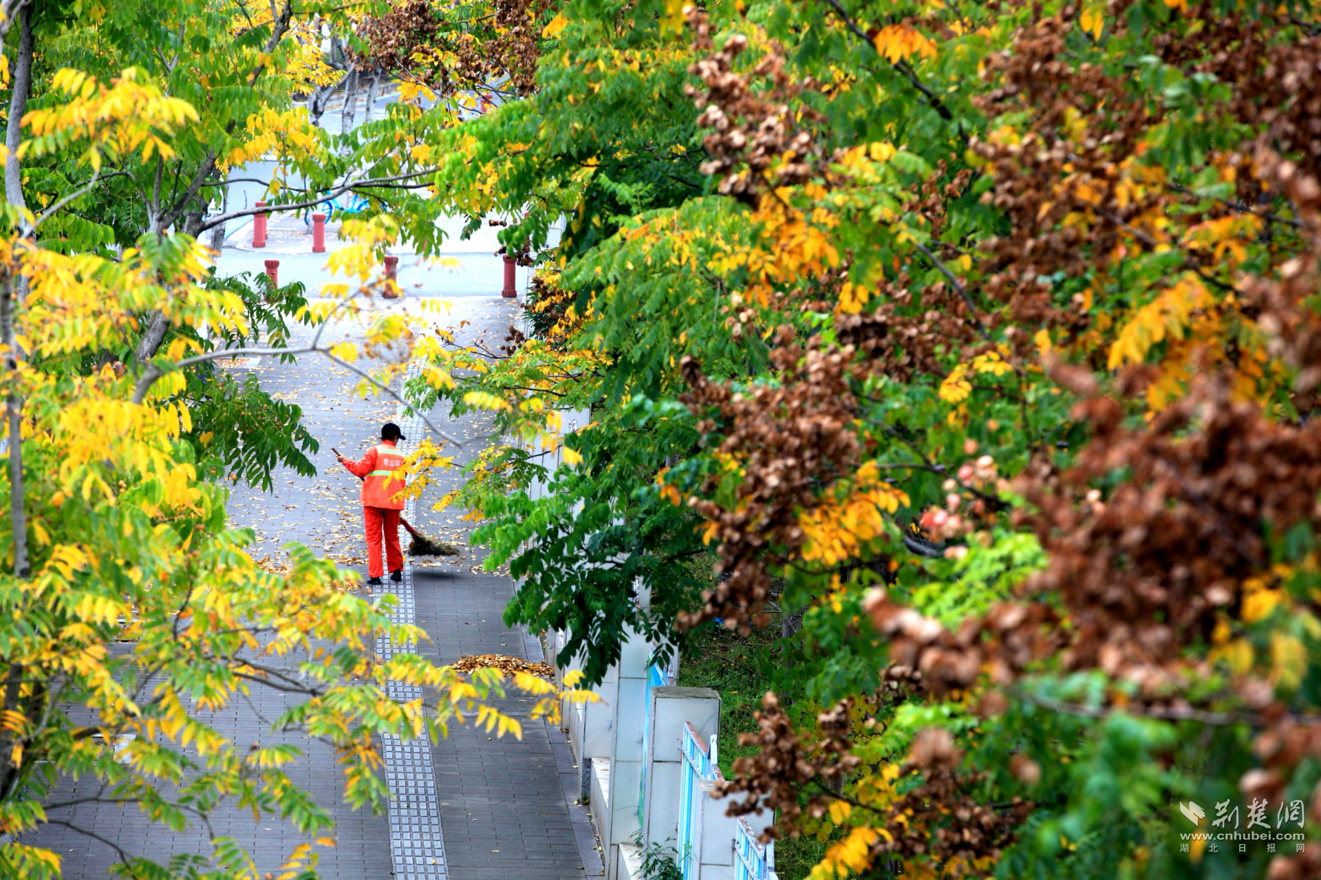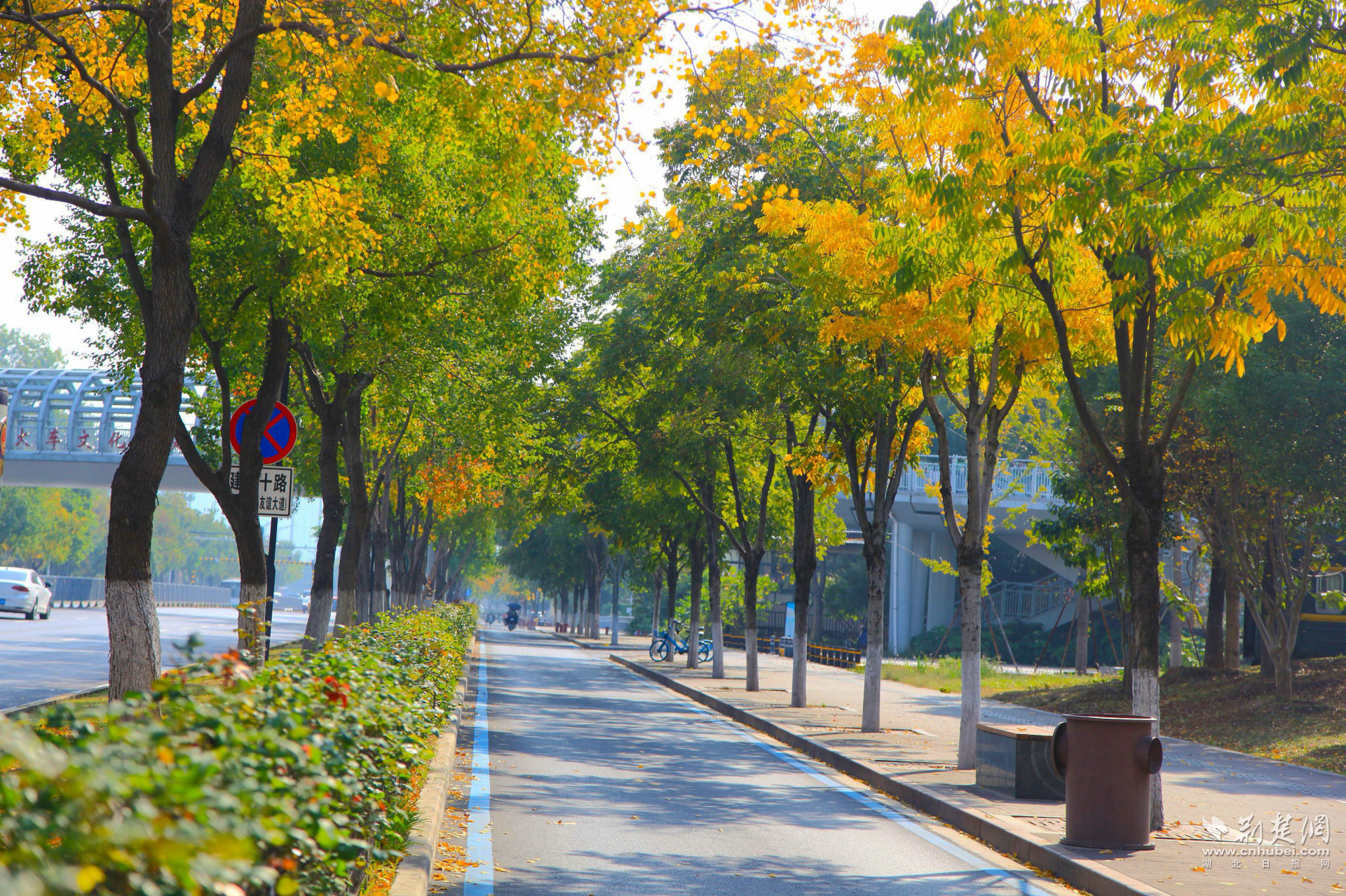 荊楚網(wǎng)(湖北日報(bào)網(wǎng))訊(記者 何婧 通訊員 杜媛媛 呂學(xué)勇 張忱)近日,武漢市青山區(qū)建設(shè)十路迎來了一年中最絢爛的時(shí)刻:無患子金黃璀璨,烏桕深紅如焰,斑斕色彩與沿途公園、綠道共同勾勒動(dòng)人的城市生態(tài)畫卷,吸引市民駐足打卡。