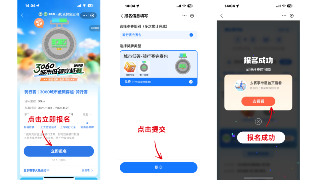 通過支付寶APP,搜索“支付寶運動”小程序進入“線上賽”專區(qū)報名參賽,或搜索“3060城市低碳穿越賽”小程序輪播頁跳轉報名。