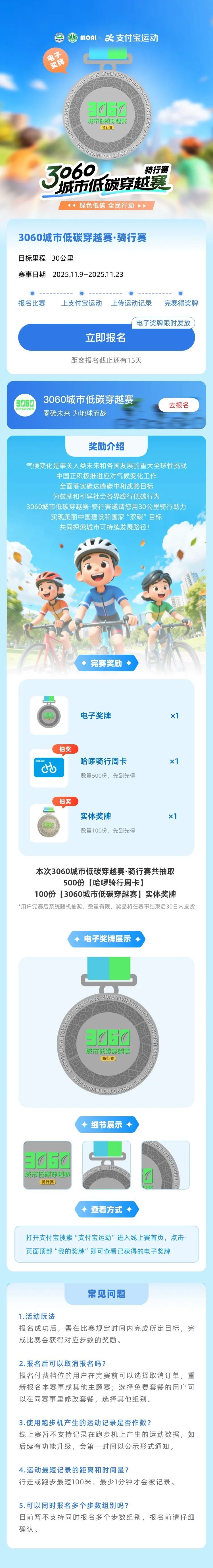騎行賽:公眾報名參加線上騎行賽,授權并上傳距離記錄,在活動時間內累計騎行30公里即可完成比賽并獲得獎勵。