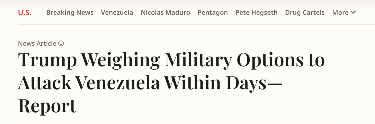 △美國《新聞周刊》報道,特朗普正在權衡于數日內對委內瑞拉發(fā)起軍事打擊。