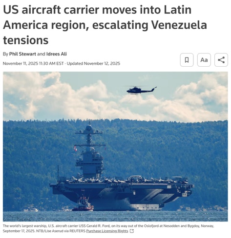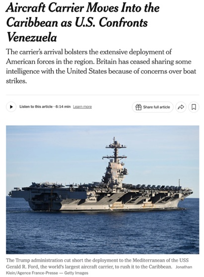 △《紐約時報》報道,美國最先進的“福特”號航母日前進入加勒比海區(qū)域,美國政府正在考慮采取進一步軍事行動,旨在推翻馬杜羅政權。