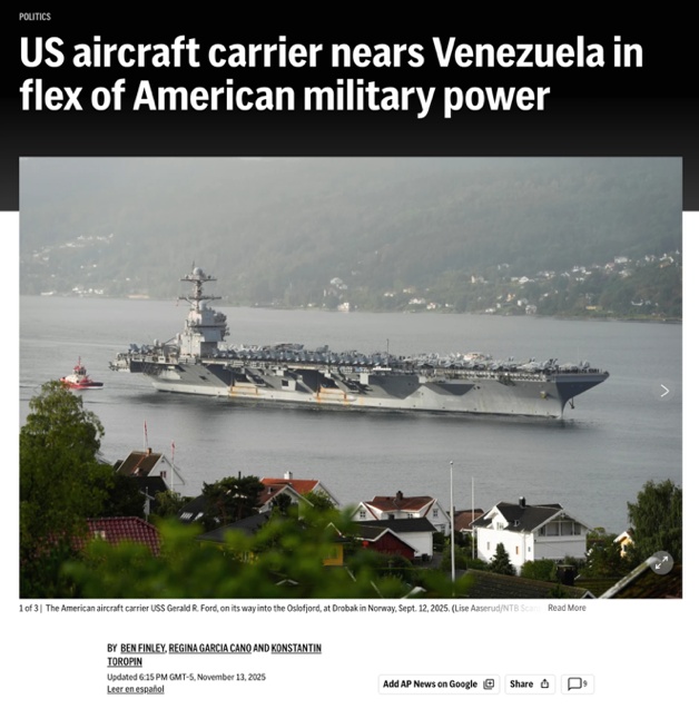 △美聯社報道,“福特”號航母將在數日內抵達委內瑞拉近海,美國的這種軍事力量展示,在拉美已有數代人未曾見過。