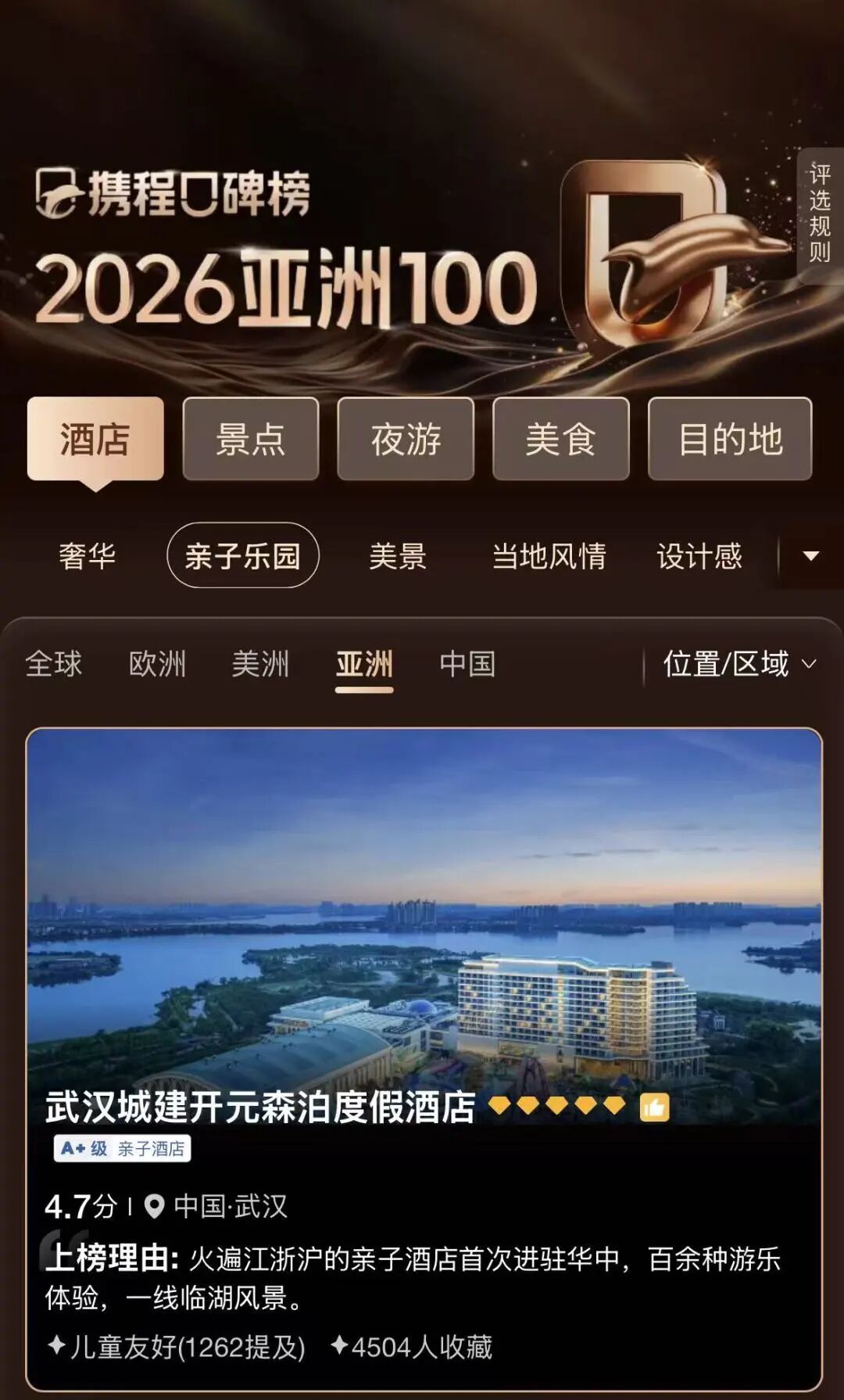 近日,攜程平臺發(fā)布《攜程口碑榜2026年度榜單》,武漢城建開元森泊度假酒店成功上榜亞洲親子樂園酒店百強(qiáng),位列亞洲第58位、國內(nèi)第29位,成為湖北省唯一上榜的酒店。
