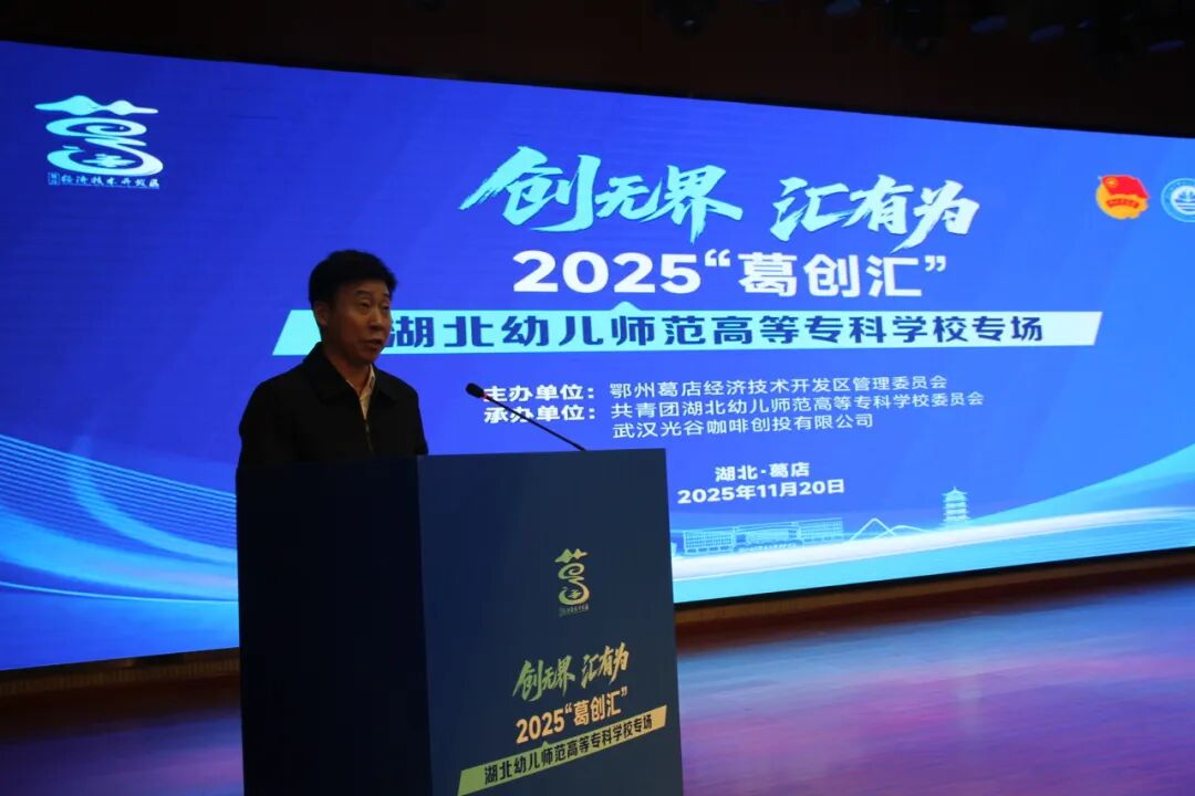 葛店國(guó)家經(jīng)開區(qū)管委會(huì)副主任柳金旗在致辭中高度評(píng)價(jià)了湖北幼專在幼教人才培養(yǎng)與創(chuàng)新創(chuàng)業(yè)教育方面的特色實(shí)踐。他表示,葛店開發(fā)區(qū)始終將高校作為區(qū)域創(chuàng)新的策源地與人才引擎,持續(xù)迭代"天天有咖啡、周周有路演、月月創(chuàng)投匯"的雙創(chuàng)服務(wù)生態(tài),為青年創(chuàng)業(yè)者提供全周期、專業(yè)化的成長(zhǎng)支持。一直以來,葛店國(guó)家經(jīng)開區(qū)致力于為追夢(mèng)者提供最優(yōu)渥土壤、最貼心服務(wù)、最廣闊舞臺(tái),將全力發(fā)揮政策引導(dǎo)與平臺(tái)樞紐作用,激活區(qū)域創(chuàng)新活力,推動(dòng)更多優(yōu)質(zhì)項(xiàng)目落地生根、開花結(jié)果,讓青年創(chuàng)新的"星星之火"在葛店這片產(chǎn)業(yè)熱土上形成"燎原之勢(shì)",為湖北建設(shè)全國(guó)構(gòu)建新發(fā)展格局先行區(qū)貢獻(xiàn)青春力量。
