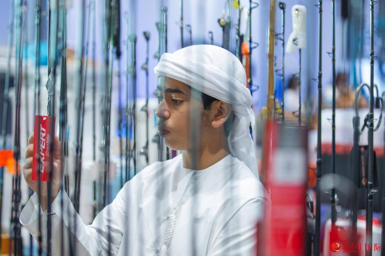 一位小觀眾在了解釣魚裝備。人民網(wǎng) 塔里克·易卜拉欣攝