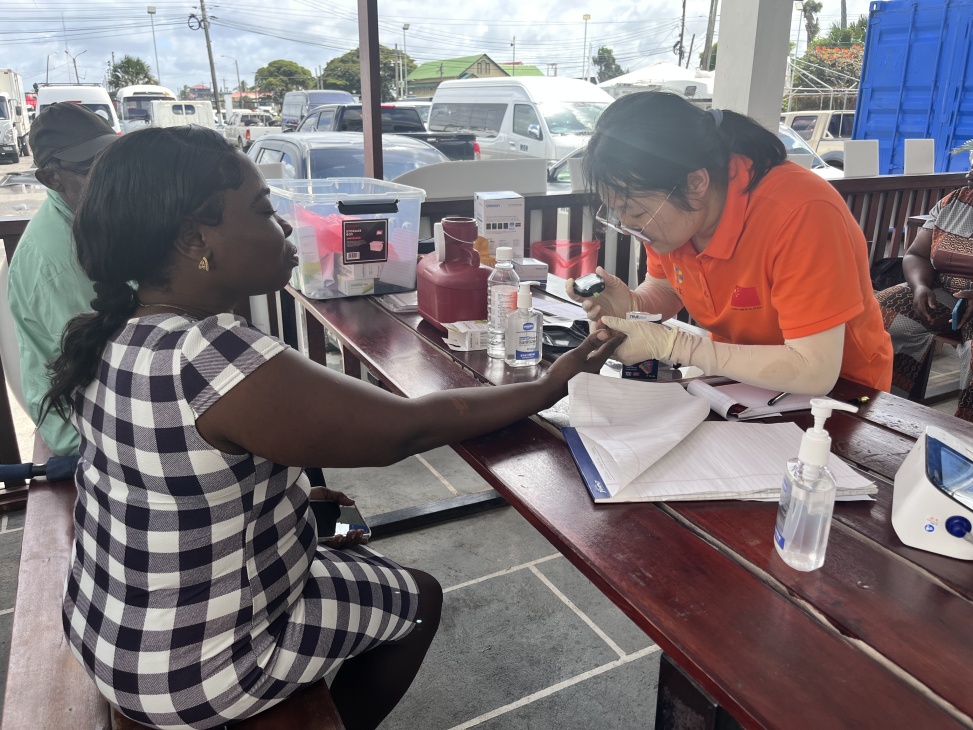 援圭亞那中國(guó)醫(yī)療隊(duì)隊(duì)員為當(dāng)?shù)孛癖娺M(jìn)行血糖檢測(cè)。第21批援圭亞那中國(guó)醫(yī)療隊(duì)供圖