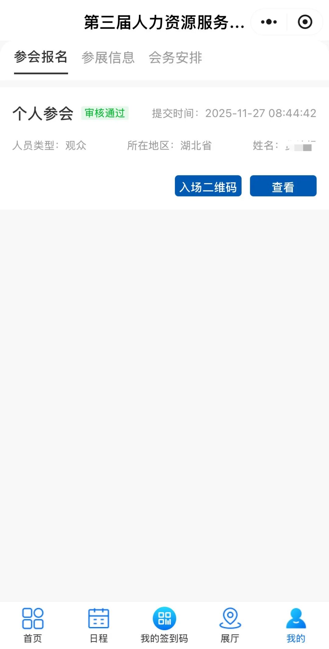 2.填寫(xiě)報(bào)名信息。依次輸入人員類(lèi)型、姓名、性別等內(nèi)容后,點(diǎn)擊提交按鈕,即可報(bào)名成功,報(bào)名成功后,可在“我的簽到碼”中查看入場(chǎng)二維碼及報(bào)名信息。