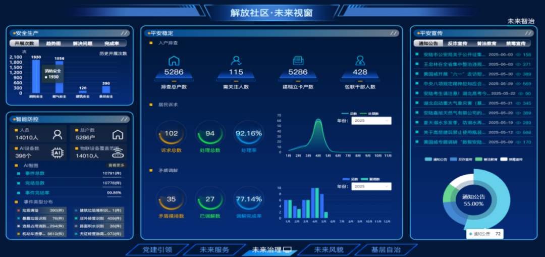 解放社區(qū)以“大屏統(tǒng)覽、中屏增效、小屏便民”三維智治體系為核心,夯實(shí)未來(lái)社區(qū)的數(shù)字根基?!按笃痢币劳腥?96臺(tái)智能設(shè)備與實(shí)景建模,實(shí)現(xiàn)對(duì)防溺水、高空拋物等20類(lèi)風(fēng)險(xiǎn)的智能感知與實(shí)時(shí)預(yù)警,構(gòu)建“天上看、地上查、網(wǎng)上管”的立體防控網(wǎng);“中屏”打通數(shù)據(jù)壁壘,支持29類(lèi)字段精準(zhǔn)檢索與一鍵報(bào)表,將社區(qū)干部從重復(fù)勞動(dòng)中解放出來(lái),專(zhuān)注下沉服務(wù);“小屏”則以微信小程序集成13類(lèi)服務(wù)場(chǎng)景,居民通過(guò)“隨手拍”“一鍵派單”“項(xiàng)目投票”等功能,實(shí)現(xiàn)“指尖參與、即時(shí)響應(yīng)”。系統(tǒng)運(yùn)行以來(lái),事件平均處置時(shí)間由2小時(shí)壓縮至30分鐘,信息填報(bào)效率提升80%,預(yù)警處置率達(dá)100%,智慧治理效能顯著。