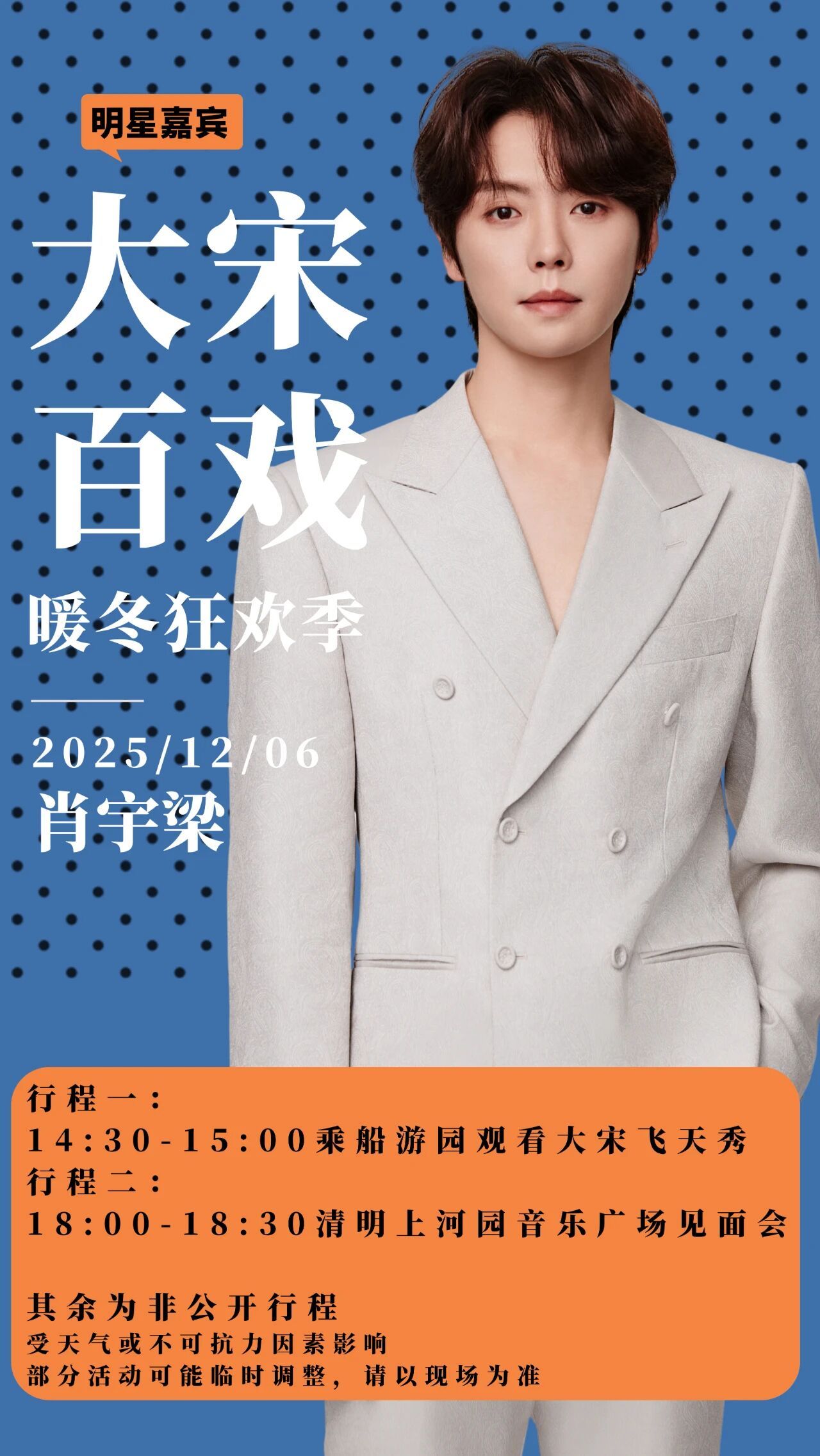 這個冬天,清明上河園寵你到底!你們想見誰,我們就邀請誰!人氣明星,一波接著一波!12月6日,呼聲超高的肖宇梁將空降清明上河園,與你們一起點燃冬日狂歡!