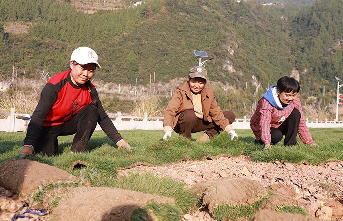 12月16日,巴東縣沿渡河鎮(zhèn)神農公園建設現場,工人們忙著鋪設草坪、栽植綠化樹,挖掘機揮舞長臂轉運泥土,一派忙碌的建設景象。