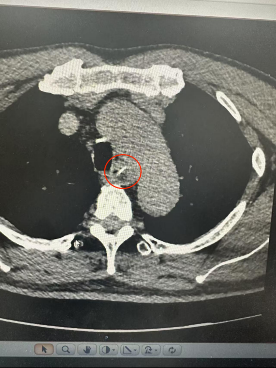 下午6時,程先生匆忙前往湖北航天醫(yī)院急診科就診。醫(yī)生檢查發(fā)現其口咽部及咽喉部未見異物,立即安排胸部CT檢查。