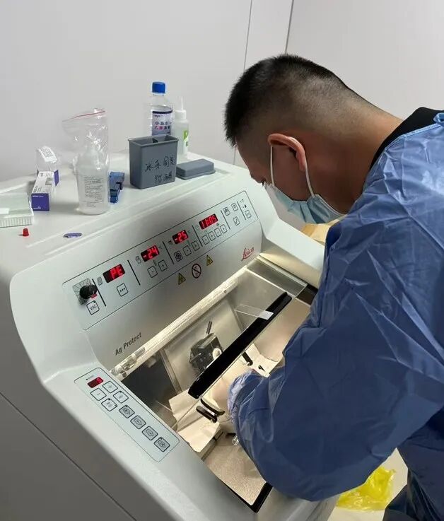 據(jù)悉,此次首例術(shù)中冰凍診斷的順利開展,源于病理科團(tuán)隊的提前統(tǒng)籌與精細(xì)化籌備。在接到東城院區(qū)手術(shù)快速預(yù)約需求后,科室第一時間啟動協(xié)同機(jī)制:診斷醫(yī)師吳建山提前一天完成全流程預(yù)演,確保診斷環(huán)節(jié)無縫銜接;技術(shù)組李蓓、盧珂清晨到崗,對切片機(jī)、質(zhì)控試劑等關(guān)鍵設(shè)備進(jìn)行全面預(yù)熱與調(diào)試,為標(biāo)本處理的高效性和準(zhǔn)確性筑牢基礎(chǔ)。