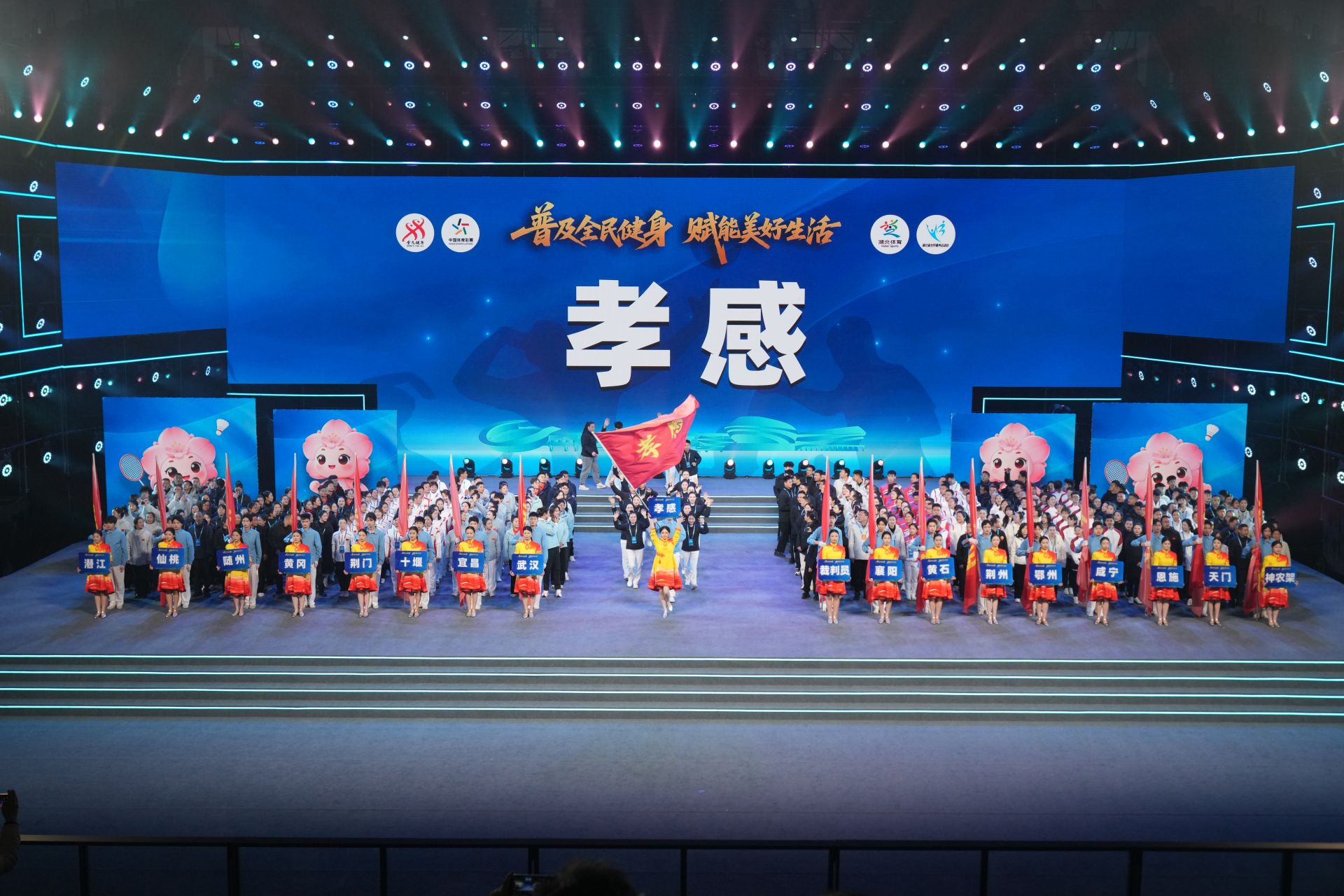 19時(shí)30分,開(kāi)幕式正式開(kāi)始。武漢、襄陽(yáng)、宜昌等全省17個(gè)地市州代表團(tuán)方陣邁著鏗鏘的步伐依次入場(chǎng),他們精神飽滿、意氣風(fēng)發(fā),展現(xiàn)著荊楚兒女奮發(fā)向上的精神風(fēng)貌。入場(chǎng)后,全體起立,共唱中華人民共和國(guó)國(guó)歌。