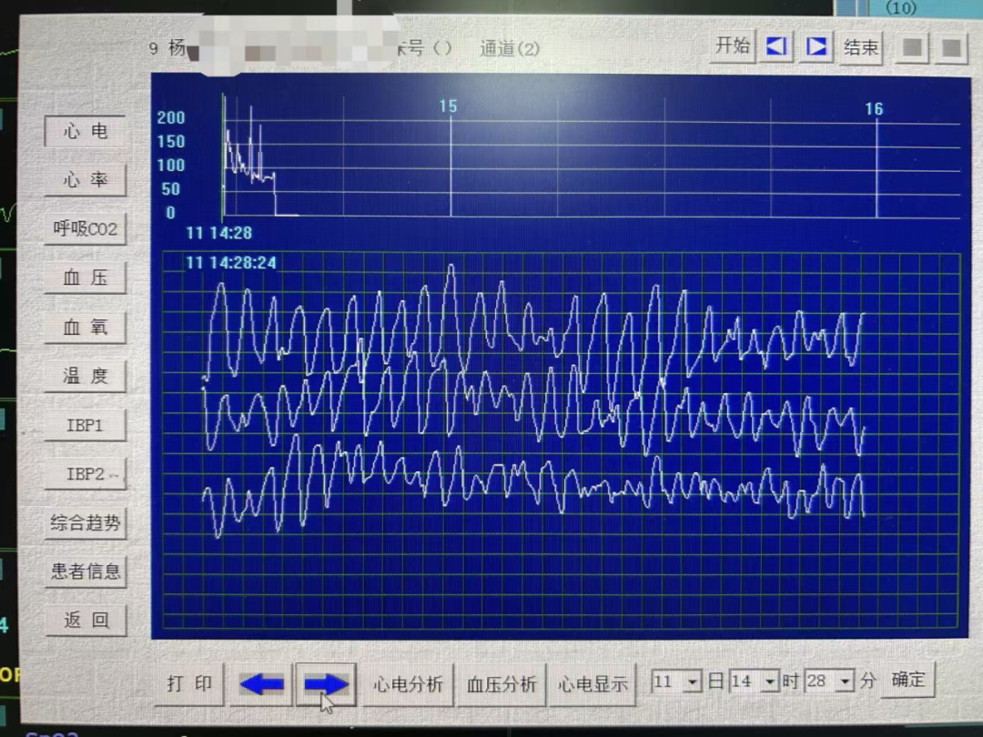 當(dāng)日14時28分,心血管內(nèi)科責(zé)任護士李文秀如往常一樣,專注地監(jiān)測著遙測心電監(jiān)護儀。突然,一陣急促而不規(guī)則的警報聲響起——那是9床楊婆婆的遙測心電監(jiān)護儀發(fā)出的警報。李文秀瞬間將目光鎖定屏幕,只見原本規(guī)律的心電波形已變?yōu)殡s亂無章的“蚯蚓狀”,這是最危險的心律失常之一:心室顫動(室顫),意味著心臟已失去有效泵血功能,患者生命正以秒為單位流逝。
